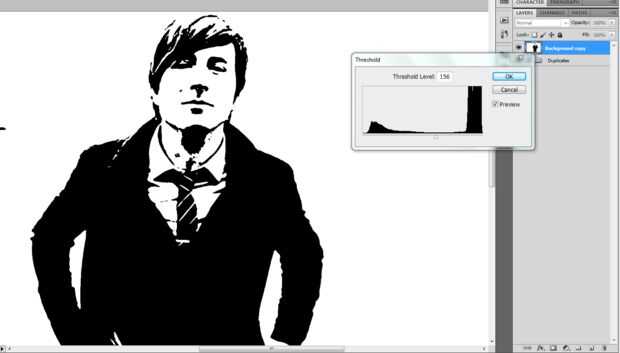 A continuación, vamos a imagen > Ajustes > umbral y encontrar un nivel que proporciona detalle a la cara y la ropa del sujeto, pero no bloquea las funciones. Configurar el nivel en 156.