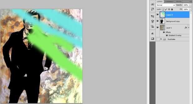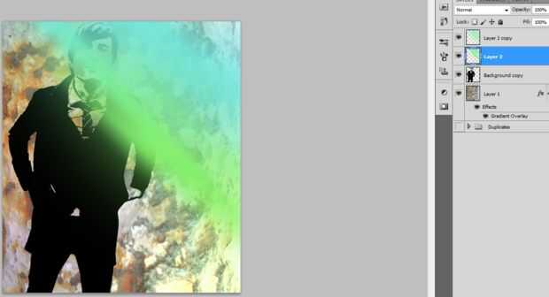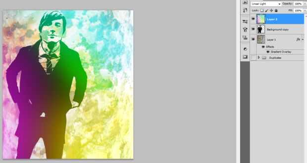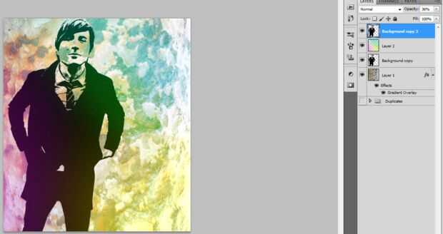 Copiar la capa con el sujeto en él y ponerlo encima de la capa de colores con una opacidad baja. Esto es así el tema se destaca más.