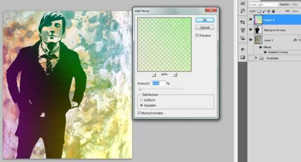 Repita con un morado en el lado izquierdo y amarillo en la parte inferior derecha. Fusionar todas las capas. Para un efecto limpio, vaya a filtro > ruido > Añadir ruido. Pulse el botón monocromático en la parte inferior, la distribución gaussiana y añadir suficiente ruido que se puede saber que está allí. Puse mi 9.51%.