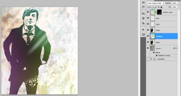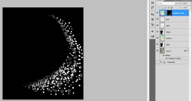 Sobre todo las otras capas, duplicar la capa de colores de arco iris. Luego ir hacia abajo en la parte inferior de la ventana de capas y buscar un icono que parece un rectángulo negro con un círculo blanco cortado. Haga clic con la capa duplicada del arco iris seleccionada. Esto debería dar a la capa de una máscara. Máscaras nos permiten mostrar solo ciertas cosas. En este caso, queremos que el arco iris sólo mostrar a través de la cadena. Sugerencia: Blanco muestra, oculta negro.