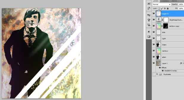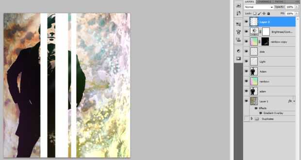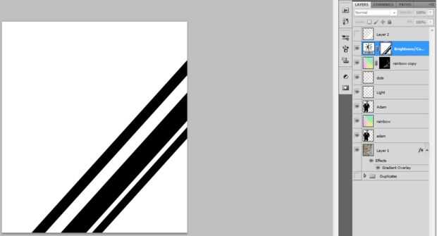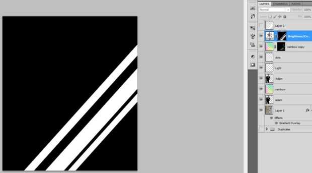 Crear una nueva capa por encima de todo y añadir algunas líneas verticales de diferentes tamaños (usé 80px, 150 px y 60 px.). Convertirlos en 42 grados y posición muy bien. Ahora ctrl + clic en el capa de líneas y Alt + clic en la máscara de capa de ajuste. Rellenar la selección de líneas con negro e invierta la máscara entera para que las líneas son de color blancas y el fondo es negro. Ahora solamente el área con las líneas se verán afectado por la capa de ajuste. Puede eliminar la capa de líneas.