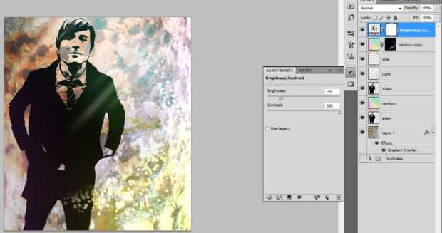 Voy a una capa de ajuste de la máscara. Por lo tanto, ir a la parte inferior del panel capas o ir a capa > nueva capa de ajuste y seleccione brillo y contraste. Ponga la capa por encima de todo y ajustado bajo el brillo y el contraste alto.