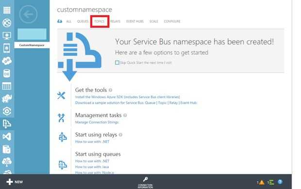 Ahora que hemos creado el servicio de autobús, es hora de agregar nuestros temas y suscripciones. Recuerdo de nuestra reseña anterior que enviemos mensajes a un tema, que luego es retransmitido a una o más suscripciones.