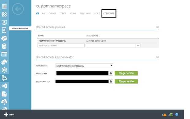 - Ir a tu panel de control 'CustomNameSpace' en el Portal de gestión de Azure