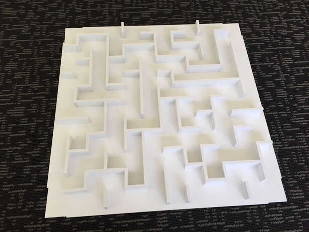Hicimos el laberinto del material del PVC. Compramos nuestro material en golpecito plástico en California. Nos tenían tiras de 1 pulgada cortadas de material de 1/4 de pulgada para que fácilmente podríamos hacer nuestras secciones de pared. La base era hoja de 1/8 de pulgada. Trabajo y pegado del PVC son más simple que otros materiales y es bastante ligero y rígido. Usted puede venir para arriba con los desafíos de diseño interesante laberinto. Intentamos bolas de 1 pulgada de madera, acero y acrílico. El acrílico dio mejor juego. Hemos pintado una esfera clara estándar.