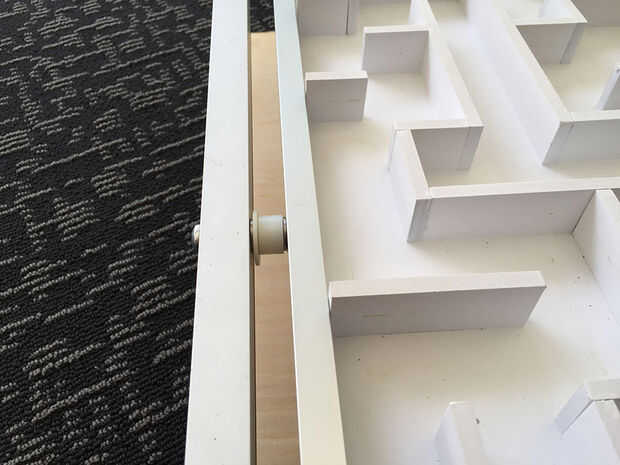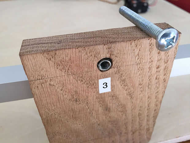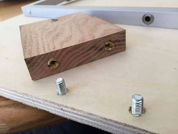 La base y soportes son de madera. Ponemos insertos roscados aquí para simplificar el trabajo con los ejes. Hemos añadido roscados en la parte inferior de los soportes para hacer limpieza de montaje. Una vez que tenga los soportes y marcos construidos puede ajustar posición final con espaciadores de nylon de 1/4 de pulgada.