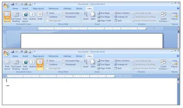 Para comenzar con, usted querrá abrir Word con un documento en blanco. Asegúrese de que palabra es en la vista Diseño de impresión haciendo clic en el icono correspondiente en la parte inferior derecha, o seleccionando Ver -> diseño de impresión.