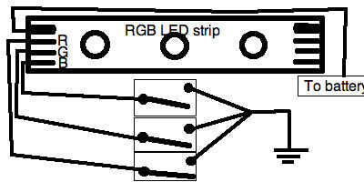Paso 5: Unas tiras de LED tienen opción de rojo, verde y azul, todos en la misma pieza. Si desea poder cambiar los colores, todo lo que necesitas hacer es hacer algunos interruptores dondequiera que usted quiere y tiene los cables van a los LEDs.
