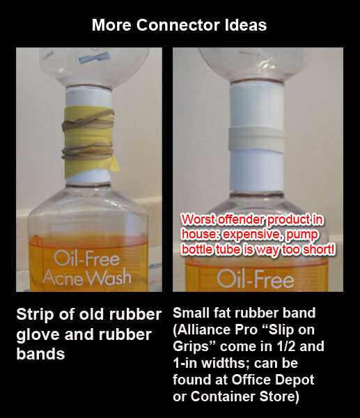 es puede ser muy frustrante tratando los últimos restos de un producto líquido de una botella, sobre todo si el producto es caro, venden en una botella de la bomba con un tubo corto no puede ser calentado o diluido. Usar unos tapones de repuesto de la vacia para hacer conectores que me permiten transferir el contenido de una botella casi vacía a una botella casi llena. Este método funciona en los productos que utilizas regularmente - porque tienen casquillos idénticos y tamaños de la botella. Si usted sabe lo que el juguete es "un tornado en una botella", este conector te parecerá familiar. Usted puede dejar las botellas conectadas, sin vigilancia, por el tiempo necesario sin preocuparse de ellos siendo derribadas. El conector puede ser reutilizado indefinidamente mientras es cuidadosos de no inundación la cinta cuando usted limpia y como el fabricante no cambia el tamaño del embalaje/casquillo.