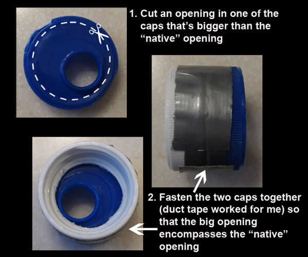 * Para empezar, que realmente necesita sólo una tapa de repuesto, porque usar la tapa de la botella casi vacía que desea vaciar y descartar la segunda mitad del conector.