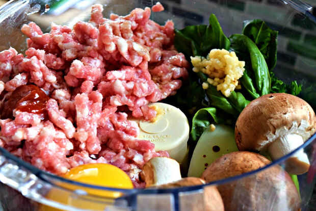 En el tazón de un procesador de alimentos, combine 1/4 de libra de cerdo de tierra, 1/4 cebolla, 1 diente de ajo, 2 hojas grandes de albahaca, 2 tallos de perejíl, un par de champiñones frescos, 1 cucharadita de aceite de sésamo, 1/2 cucharadita de salsa picante (como Sriracha), un chorrito de salsa de soja, 1 pizca de sal y un huevo mediano. Pulso hasta que se combinan.