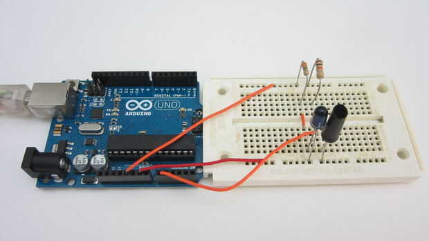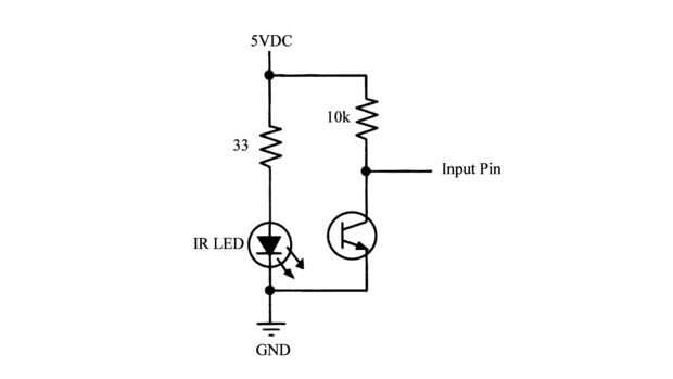 El LED IR está conectado a la fuente de 5V con una resistencia de 33 ohm serie. Para encontrar el resistor adecuado valor el LED utilice esta fórmula: