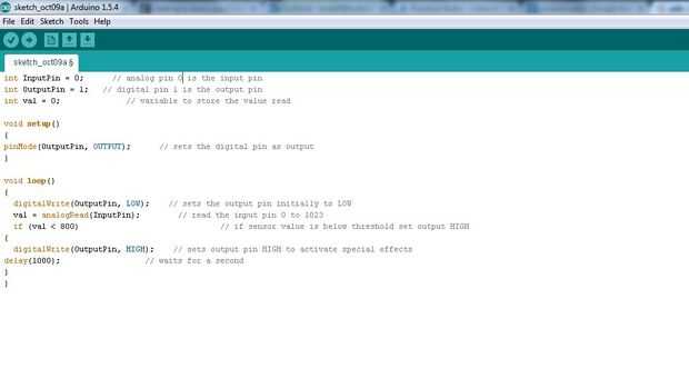La función AnalogRead mide el voltaje de la señal proveniente del sensor. Cuando el voltaje cae por debajo de un umbral fijado, el Arduino activa la sus efectos especiales. Aquí está un ejemplo rápido del código que puede utilizar.