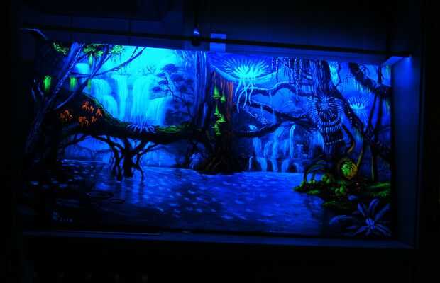 Hace algún tiempo descubrí lo que es pintura UV y decidió probarlo. Algunos artistas que encontré también intentaron combinar pintura luz con pintura UV. Significado que durante el día ves una pintura normal, y si la habitación va oscurezca y luz uv, la pintura se ve sólo como una escena de Avatar por la noche, brillante, brillante,... y repente me quería hacer de esto un hobby mío.