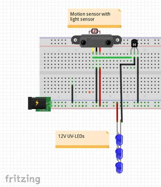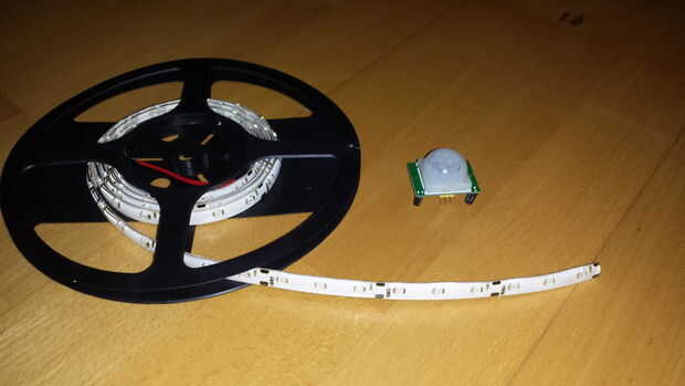También utilicé unsensor de movimiento para limitar los tiempos y el tiempo de exposición. Desde la salida del sensor de movimiento era menos de 12V y la vere de LEDs no lo suficientemente brillante, le puse un transistor TIP122 entre ellos para controlar los LEDs basados en la entrada de sensores de movimiento. Este sensor de movimiento específico también está preparado para el uso de unafotorresistencia. Si, luego la tira de LED sólo se enciende por la noche y cuando detecta movimiento.