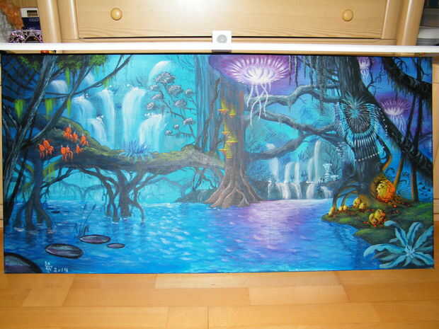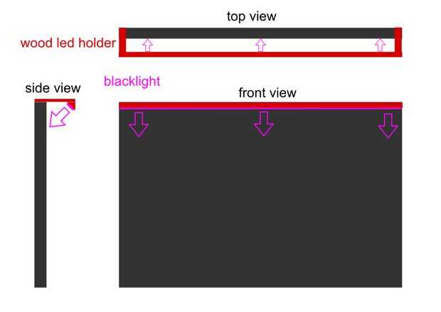 El siguiente paso es construir un soporte para la fuente de luz negra. En mi caso el LED tira construí un soporte de madera sobre la cual pintura proyecta la luz de cerca de 13 cm de distancia y ángulo de 45 grados.