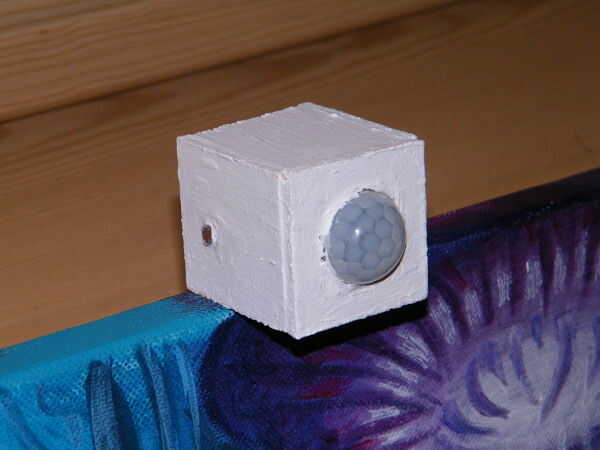 También para el fotoresistor construí una pequeña caja de sensor de movimiento también hacia fuera de madera y pegadas en la parte superior. Creo que la próxima vez sería más fácil una caja de cartón.