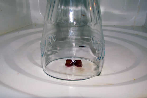 Coloque la taza sobre el grape.make seguro que el aire no es totalmente restringido. Nota importante-cambio la taza cada 2 a 3 pruebas y se va a explotar. (Hablo por experiencia). Luego de ponerlo en unos 10 a 15 segundos (dependiendo de su horno de microondas). Y finalmente lo destroce, me encanta hacerlo experimentar su divertido fácil y no necesita una gran cantidad de materiales. puede tomar un par de intentos y dos diferentes tipos de uvas. Aquí está la prueba que he hecho este experimento.    http://www.youtube.com/watch?v=QwzmYHy9Hhc