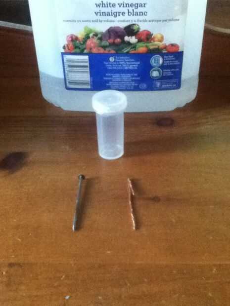 Vous aurez besoin de: 1 pote de pillule, 1 fil de cuivre grossier, 1 clou (un peu plus grand que le bote) et du vinaigre blanc.