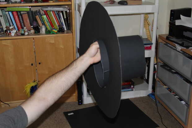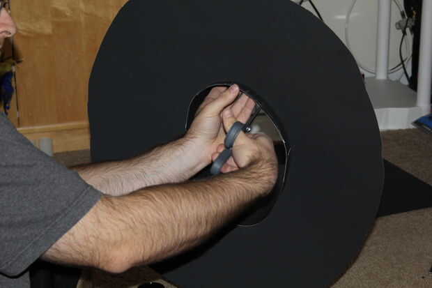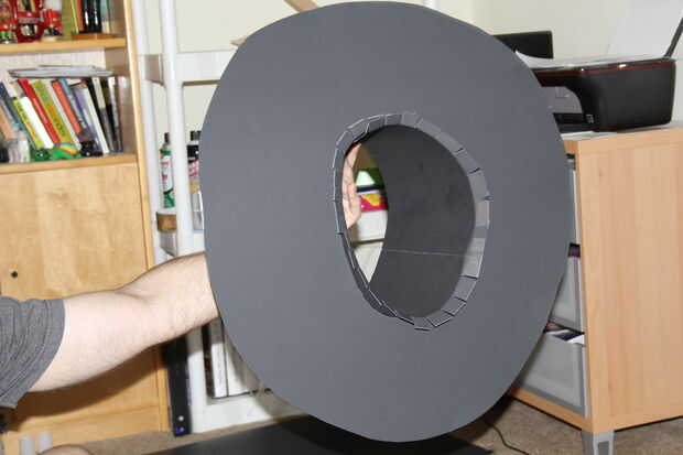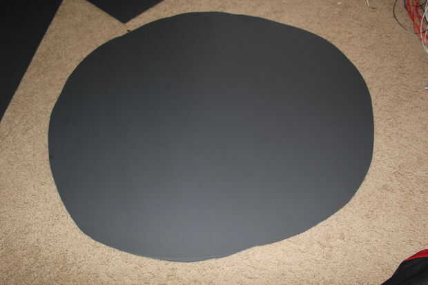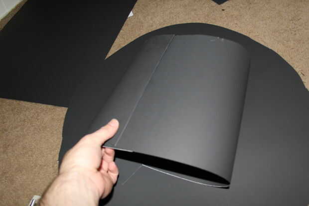 Corte un círculo grande en el papel negro. Cortar un círculo de aproximadamente el tamaño de su cabeza. Mantener el centro, que se utilizará para la parte superior del sombrero. Para el mejor ajuste, corte ligeramente más pequeño que la cabeza. Luego poner la cabeza en el agujero. Si no encaja como un sombrero, perfore el orificio un poco proceso de tamaño mayor y de la repetición.