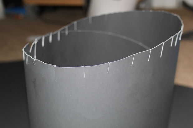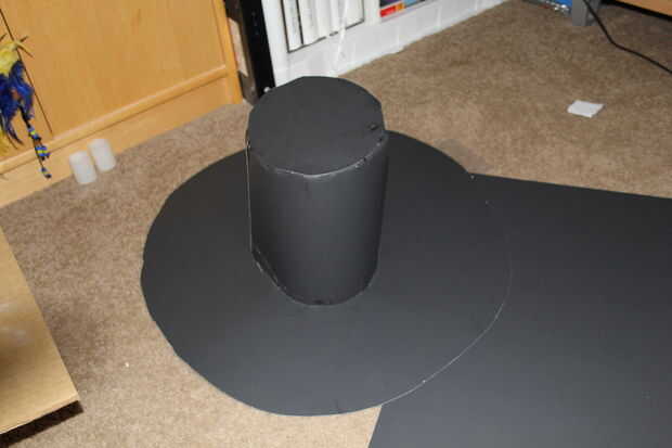Con la segunda cartulina negro, corte un rectángulo de aproximadamente 10" ancho y largo suficiente para caber en el círculo (~ 4" más que la circunferencia de su cabeza funciona mejor). Rodillo de la hoja del rectángulo en un cilindro. Hacer la parte superior ligeramente más delgado que la parte inferior. Ahora deslice ese cilindro en el borde del sombrero hasta que quede aproximadamente 1" de la misma. Usando las tijeras, corte las ranuras en el rectángulo. Doble los bordes hacia arriba y pegar al cuerpo del sombrero.