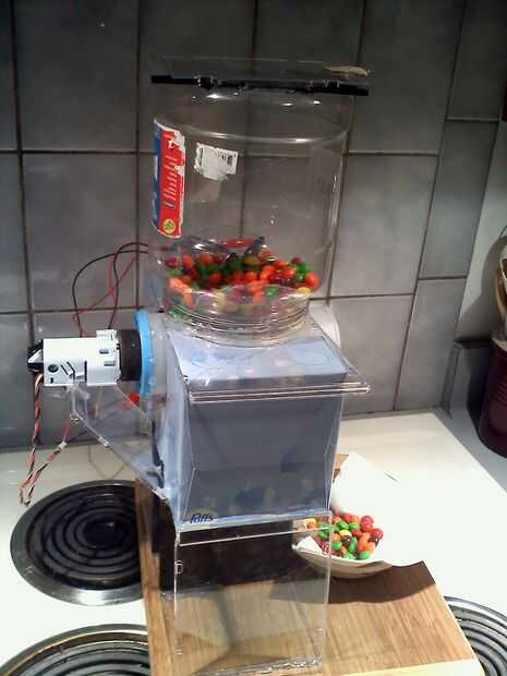 Corte un centímetro 2 rectángulo de 4 cm en el lado del tubo revirado. Esto permite que el dulce caiga en el tubo revirado como gira alrededor y también permite el caramelo a la salida el tubo a medida que gira hacia abajo. El caramelo cae entonces en el canal de corte en la base de la caja del tejido.