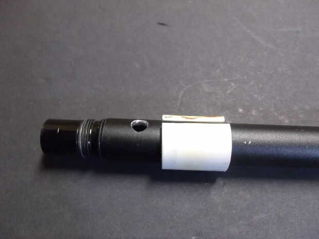 Por lo tanto, tornillo de cañón todo el camino en y marca un lugar sobre una media pulgada desde la parte delantera de la pistola directamente en la parte superior, como se muestra. Doble comprobarlo luego perfore hacia fuera. El tamaño de la broca no importa mucho, como un BB pasará a través de él con espacio de sobra.