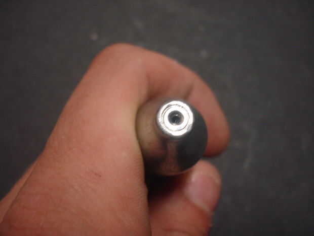 cortar el extremo puntiagudo como se muestra. Arena o archivo abajo alrededor del borde exterior de esta pieza por lo que aparece en la parte posterior del cuerpo del paintball, mientras sigue permitiendo que el barril completamente a enroscar.