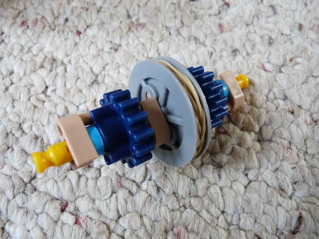 5: otro punto de vista. Hay un #32 elástico doblado alrededor de que la rueda como se puede ver. Esto puede o puede no ser necesario para agarre dependiendo de si el teleférico se va cuesta arriba en cualquier momento. Sugiero agregar cueste lo que cueste.