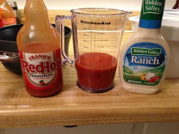 Mida 12 oz de francos y vierta en la olla de 4qt junto con el queso crema. Se puede medir por el aderezo Ranch pero una típica botella de 16oz, sólo alrededor de 12oz viene fácilmente hacia fuera de todos modos, pues adelante y squirt tanto como usted puede en el bote y ahorrar tiempo. Puede siempre agregar más ranch o salsa picante más adelante a gusto.