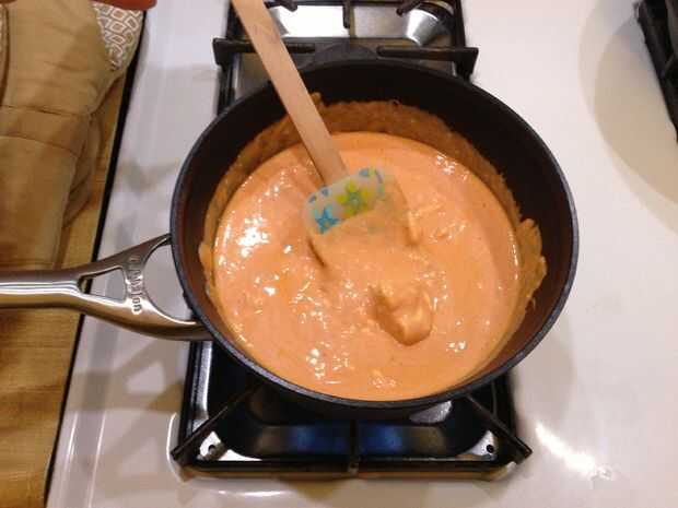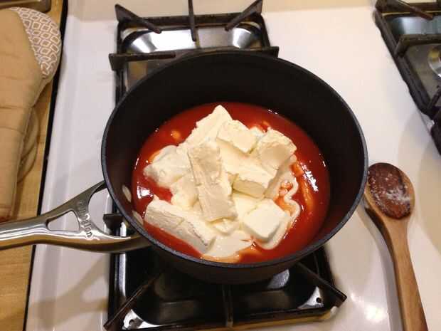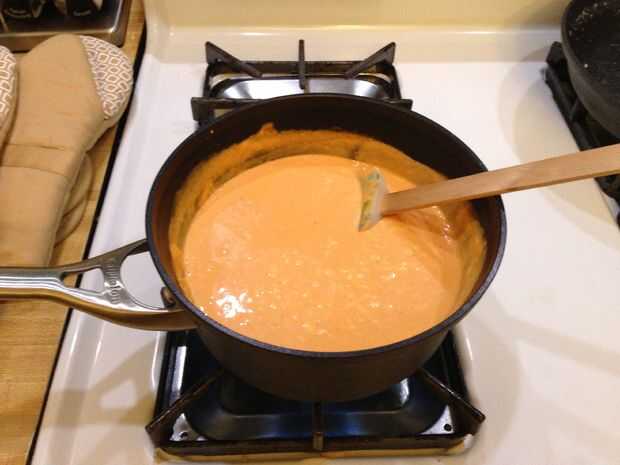 El calor en la salsa a medio-bajo y mezclar los tres ingredientes. Si la salsa comienza a burbujear mucho reducir el calor.