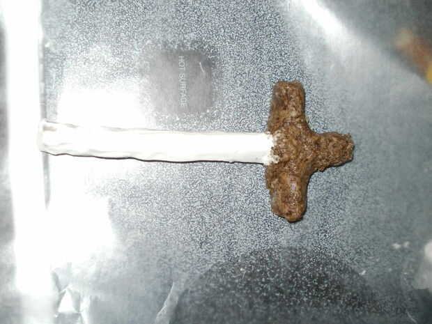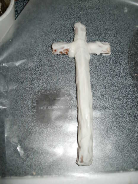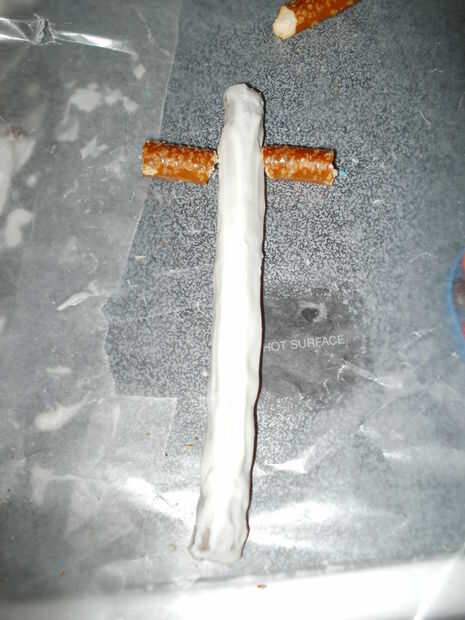 Para conseguir el mango marrón, tome un bloque o dos de su corteza de almendra y fundirlo (puede que tengas algunos izquierda aunque). Luego añadir en igual cantidad de colorante de alimentos rojo, azul y amarillo hasta que estés contento con el color. Porque usé colorante alimentario líquido la corteza de la almendra se dirigió a una textura arenosa. Después aplicar su corteza color almendra a la espada por el mango