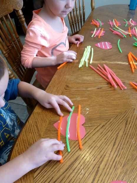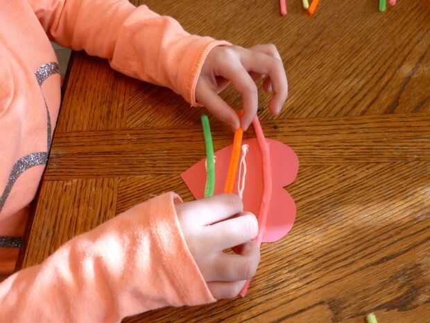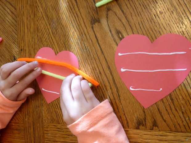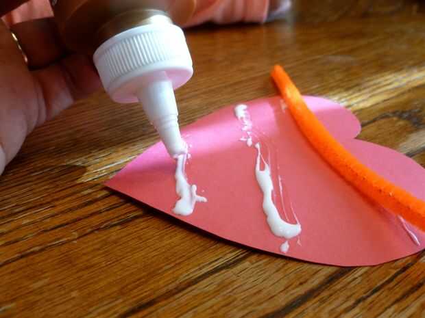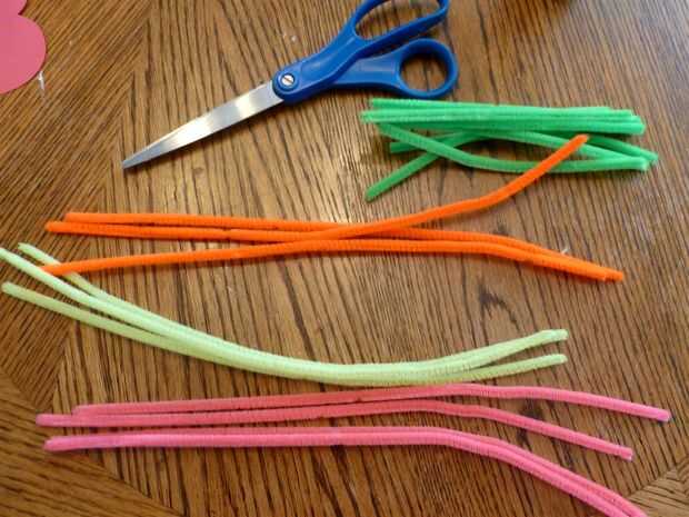 Quería que mi hija a hacer la mayor parte de la obra misma, por lo que después corté el limpiapipas por la mitad, establece tres franjas de pegamento adhesivo en el lado sin firmar, o del corazón.