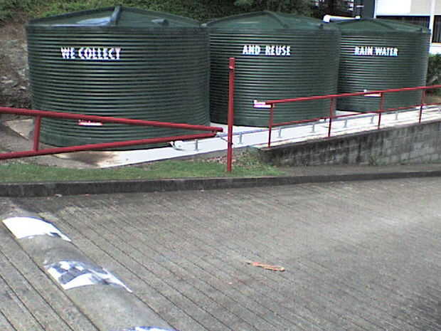 En nuestro lugar de trabajo tenemos tres 15000 litros tanques. Recogen de un techo de hierro corrugado de skillion de 250sqm a nuestro almacén. Tenga en cuenta la señalización, ayuda a la imagen pública.