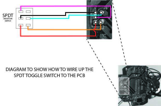 Siga el cableado diagrama arriba para cablear el interruptor a la placa de circuito. El alambre que usé fue que un 22 flexible cable de calibre. Elegí este cable como alambres de calibre más pesados son más propensos a ripear las pistas de la placa de circuito cuando flexiona debido a la rigidez de calibres más gruesos.