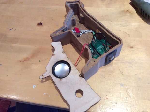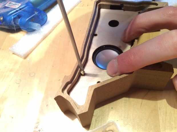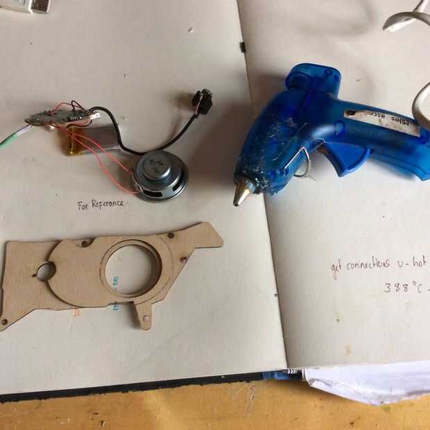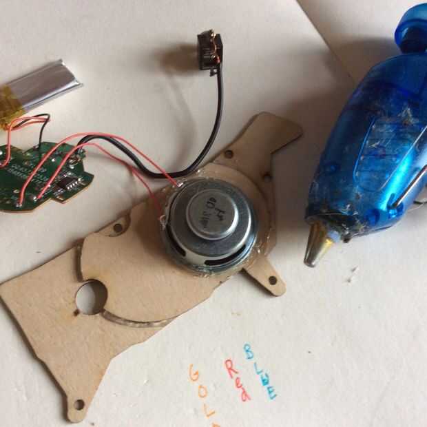 3. Con una pistola de pegamento caliente Conecte el altavoz a la hendidura en los paneles de madera contrachapada.