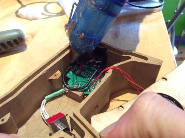 8. Pegamento caliente el cable que viene de la mujer aux a la carcasa para evitar que se confunde.