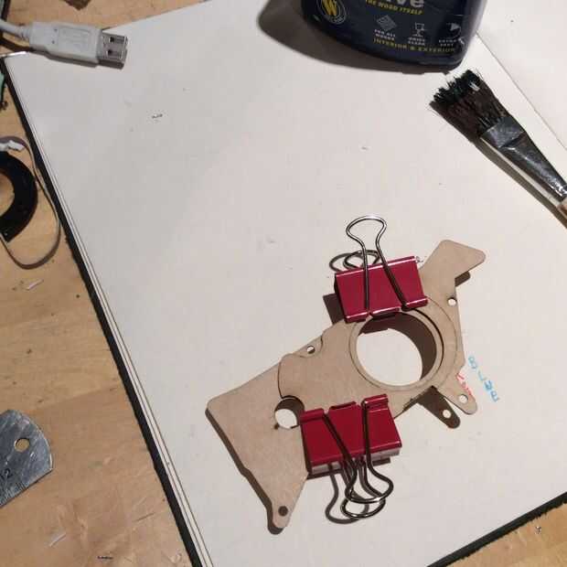 1. Comenzar pegando las dos piezas de contrachapado de 1,5 mm