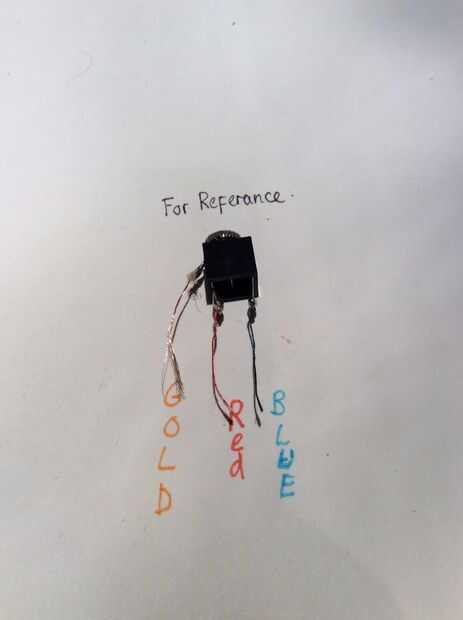 3. Tomar los tres cables y soldarlos a las tres etiquetas de la entrada Aux femenino según la foto de referencia anterior. Oro al exterior etiqueta roja y azul a las etiquetas de la parte dos inferior.