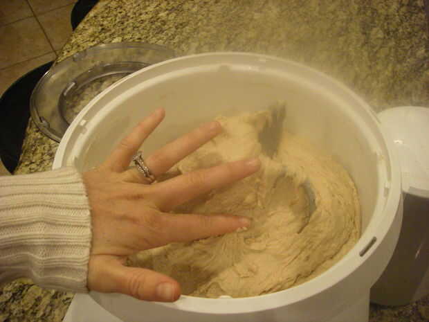Agregar levadura, agua, la sal y la mitad de la harina necesaria para una bosch mezcla bowl (u otro mezclador grande) mezclar hasta consistencia de una pasta pegajosa.  A continuación, mientras se mezcla en baja, añada la harina restante 1 taza a la vez hasta que la masa se desprenda de los lados.   Sabrás que tienes suficiente harina si apenas es pegarse a los dedos entonces soltar.  A continuación amasar durante 10 minutos en low.   (También puede utilizar un recipiente envejecido antiguo llano para mezclar y luego amasar a mano 15 minutos.)