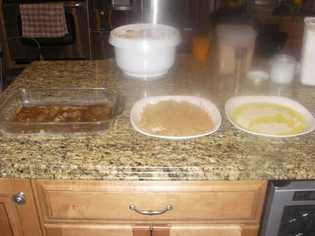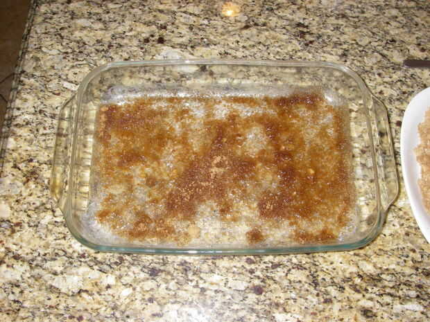 En un plato de pyrex de 9 x 13 Vierta cerca de 1 TB de mantequilla derretida, lo suficiente para cubrir la parte inferior y una fina capa de azúcar de canela.