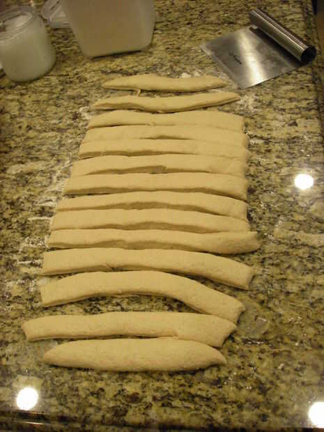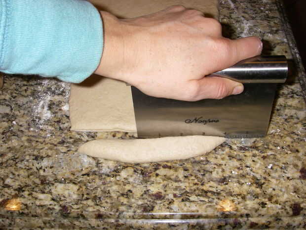 Con una masa cortador o cuchillo cortar en tiras de 1 pulgada.