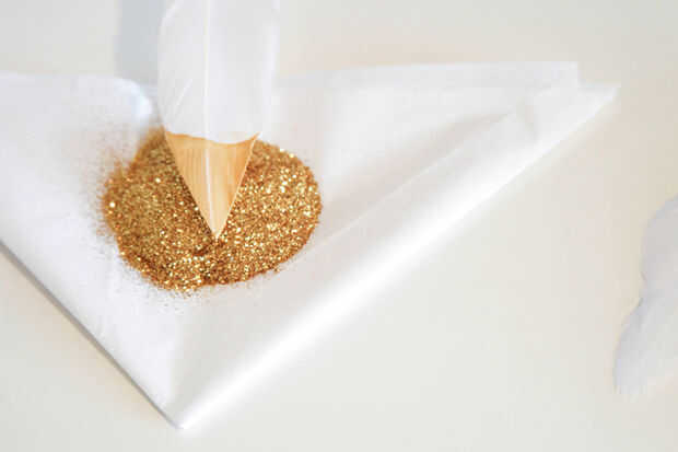 De tiempo de brillo. Usted puede cualquiera Presione la pluma hacia abajo en el brillo como se muestra a continuación, repetir en ambos lados hasta que totalmente cubierto, o espolvorear la purpurina en mano, que funciona mejor pero es desordenado. Para cualquier método, golpee la pluma sobre su brillo un par de veces cuando termine para quitar cualquier exceso.