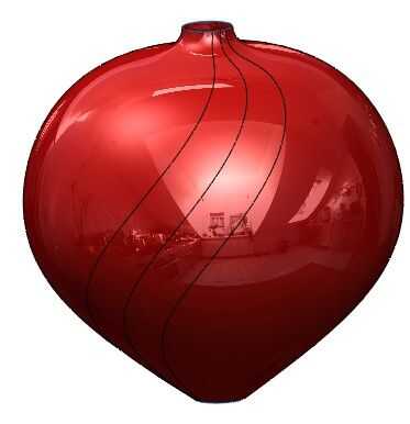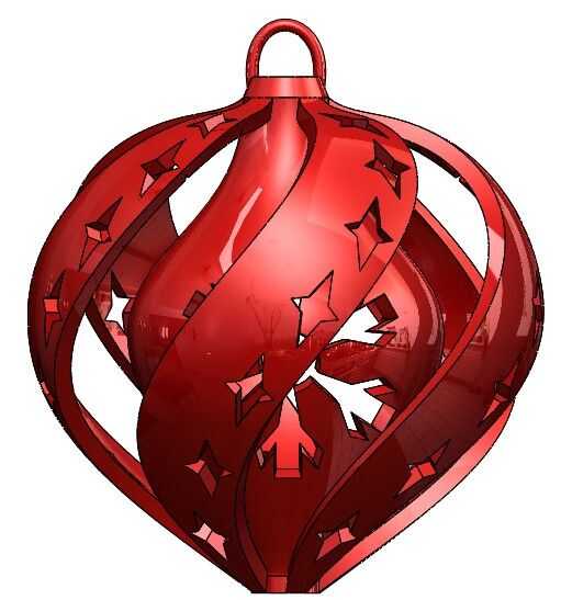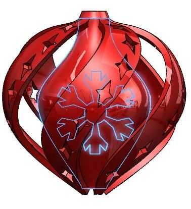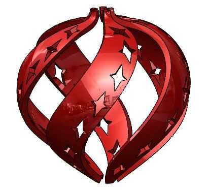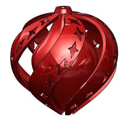 Este ornamento fue el diseño en software CAD de SolidWorks. La forma general se creó utilizando una superficie de revolución, que luego fue ajustada usando una línea de fractura creada a partir de una curva de intersección. La astilla curvas fue espesada, estrellas fueron cortadas de ella y la astilla fue modelada luego en un círculo. La bombilla interior es una superficie tipo loft con forma de copo de nieve eliminada usando la línea de fractura y eliminar rasgos. El ornamento es rematado con un lazo de barrido en la parte superior para fijación fácil del árbol!