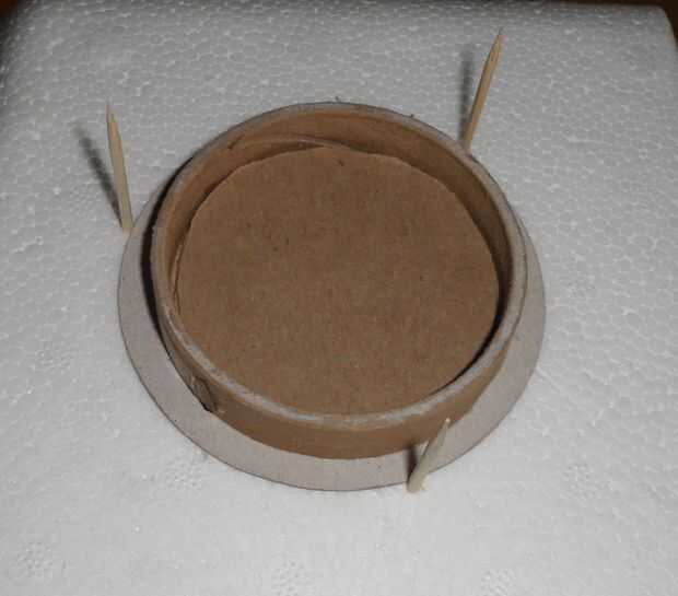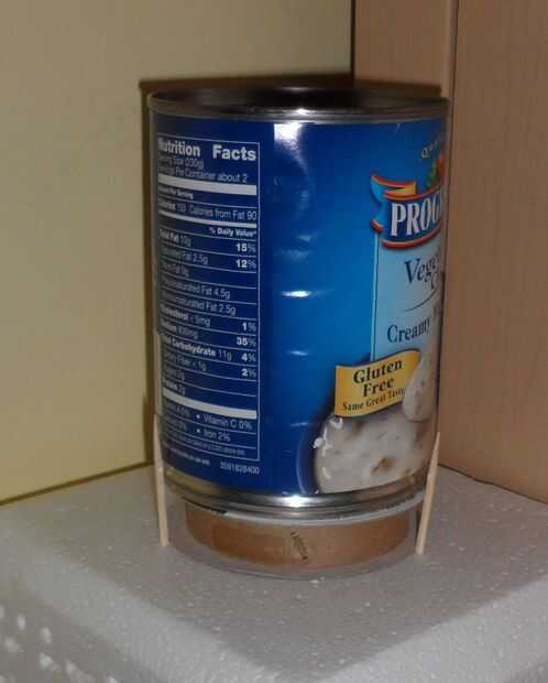 Poner nuevo dentro de base dentro del contenedor, Aplique pegamento pegajoso al borde superior y poner en la parte inferior preparado. Coloque la lata de sopa en la parte superior y deje que se seque.
