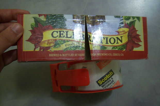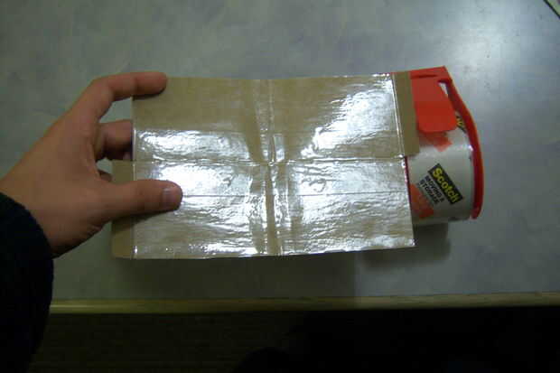 Primera capa de todo el lado de la cartulina con una capa de cinta marrón, entonces el lado con la obra de arte. Esto le ayudará a hacer el cartón fuerte y resistente al agua.