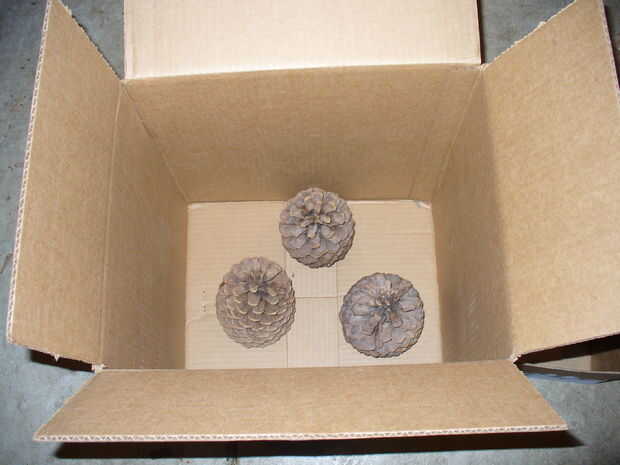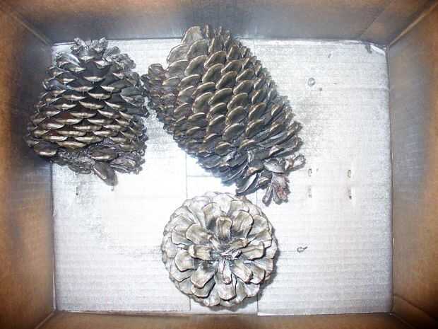Coloque las piñas en una caja de cartón abierta y pintura de aerosol les plata. Asegúrese de girar a las piñas como que está pulverizando para que usted obtenga cobertura incluso en la piña.