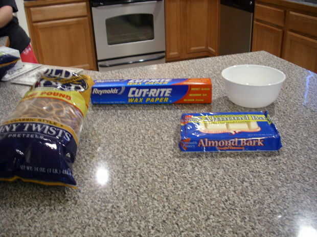 Antes de comenzar a hacer este convite delicioso vacaciones debe establecer todo que usted necesita completarlos. Usted necesitará corteza de almendra, Prezels, taza, papel encerado, tenedor y un cuchillo.