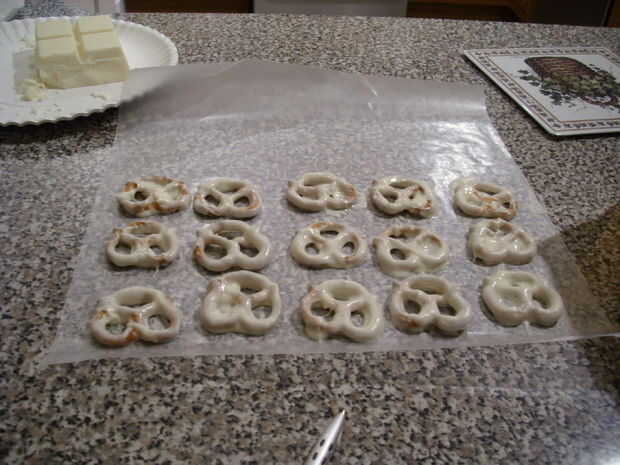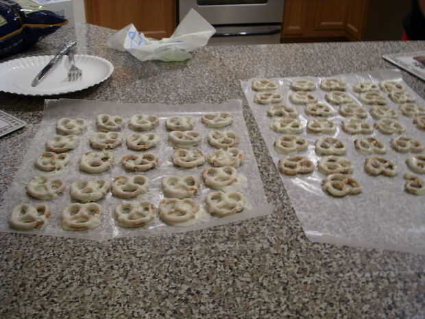 Una vez en el papel de cera tiene que estar ahí hasta que se hace el prezel secado. Mientras está secando eso prezel puede continuar dip prezels y colóquelas en el papel de cera. Si le toca quedarse sin corteza de almendra, repita los pasos. Seguir a repetir los pasos hasta que desaparecen todos los pretzels o te quedas sin corteza de almendra.