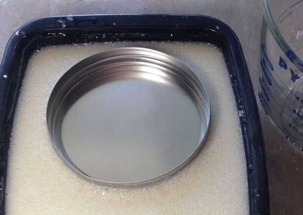 Mezclar el polvo de InstaMold con agua caliente según las indicaciones del paquete y vierte en el plato plástico desechable (salvarlos de las comidas de microondas) que es más grande y más profundo que el elemento que desee hacer un molde con. Quería una llanura plana círculo, así que utilicé la base de 5" redonda lata de regalo que fue aproximadamente de 1" de profundidad. El proceso de moldeo no daña el elemento – la lata era fácil de limpiar y guardar luego. Después de pocos minutos, suavemente sumergir la lata en el Instamold (tendrá una sensación ligeramente gelatinosa) un poco más de medio. Usé la cresta en la parte superior de la lata como guía para asegurarse de que mi base tiene profundidad incluso todo el camino alrededor. Cuidadosamente mantenga la lata en su lugar durante unos minutos mientras el Instamold establece algunos más (descansar las manos en el borde del plato plástico). Dejar ir cuando la lata permanece puesta por sí mismo, trate de no mover de su posición original.